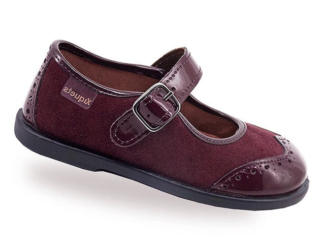 Merceditas niña burdeos en serraje piel, puntera troquelada en charol, planta piel, piso de goma antideslizante y cierre tipo hebilla.