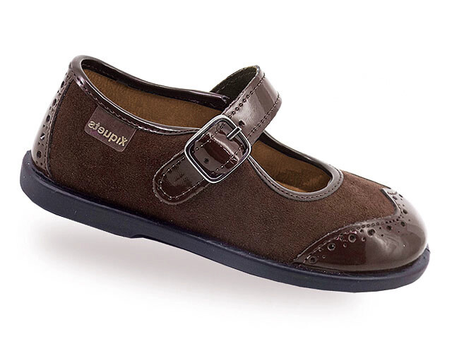 Merceditas niña marrón chocolate en serraje piel, puntera troquelada en charol, planta piel, piso de goma antideslizante y cierre tipo hebilla.