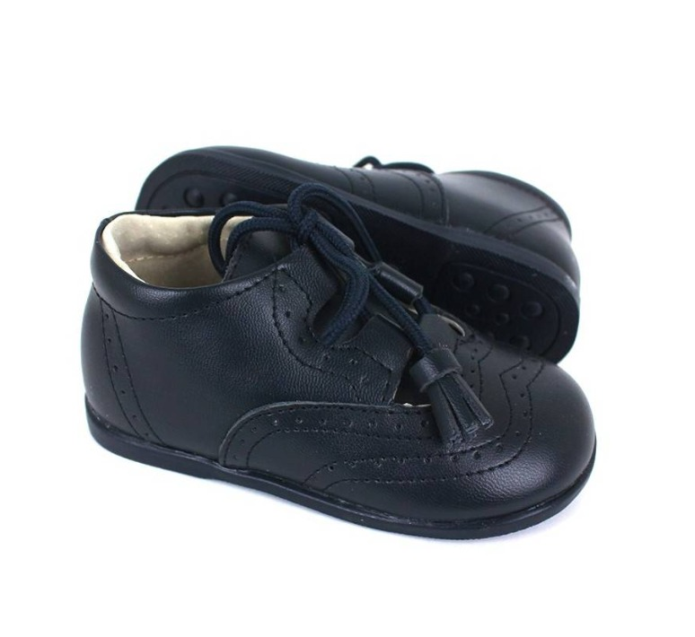 Zapato inglés fabricados en piel en un bonito color azul marino. Cordones al tono terminados en unos bonitos flecos. Abotinados adecuados para dar sus primeros pasos. Suela de goma en el mismo tono. Ver más